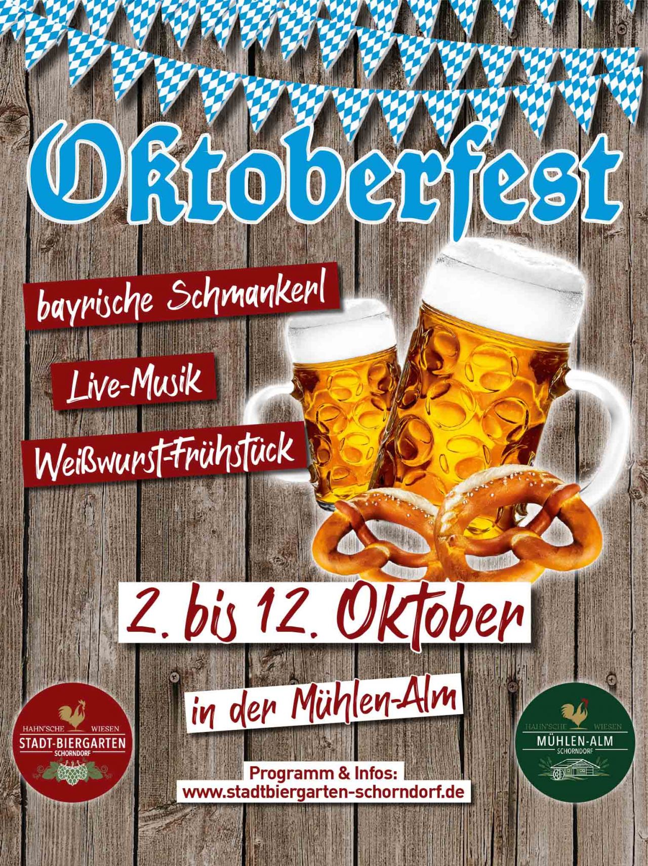 O‘zapft is – auch Schorndorf hat jetzt ein Oktoberfest. Und zwar in unsere Mühlen-Alm auf der Hahn’schen Wiesen. Elf Tage lang – von Donnerstag, den 2. Oktober bis einschließlich Sonntag, den 12. Oktober. Mit allem was dazugehört: einem anständigen Musik-Programm und dem passenden Essen. Neben dem Angebot der normalen Speisekarte gibt es ofenfrische Schweinshaxen und Krustenbraten mit verschiedenen handgemachten Knödeln, Backhendl, Schweinsbraten, Kraut etc.